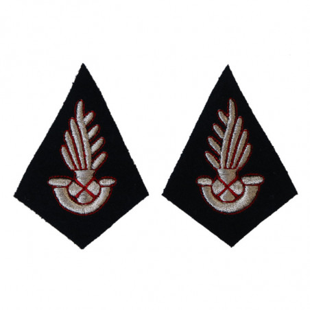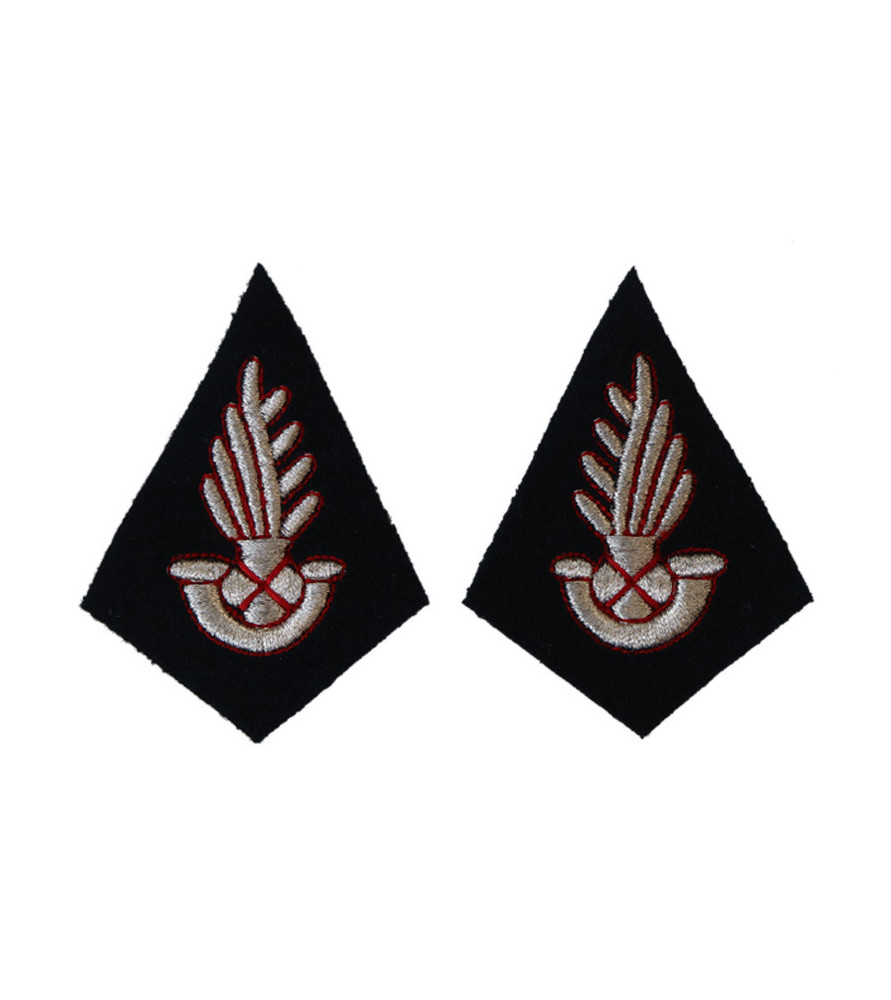 2 pattes de col de pour le corps militaire des Douanes brodés de fil avec son insigne cor de chasse et une grenade imbriqué.